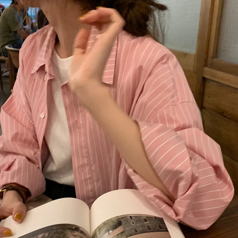 deanwangkt Pink Striped Shirts for Women Spring Summer Korean Loose Turn Down Collar Long Sleeve Tops Casual Harajuku Blouses