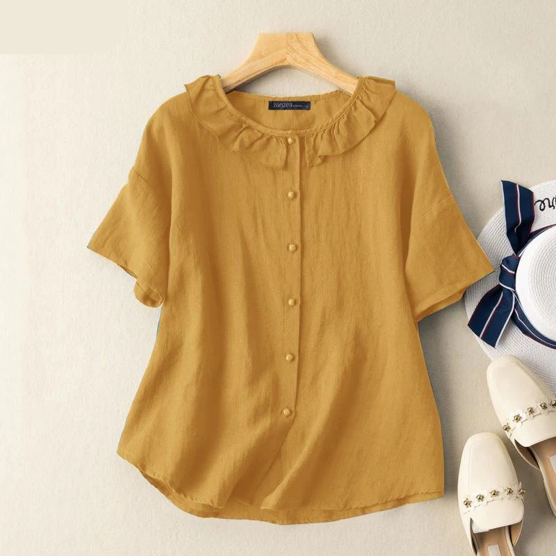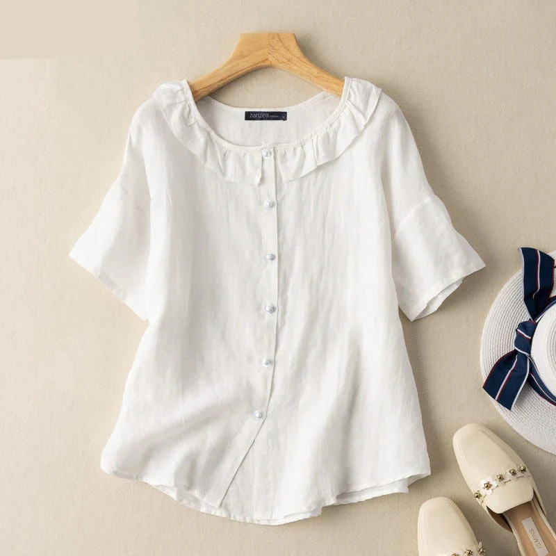 Fashion Solid Ruffle Tops Vintage Cotton Blouse Women Casual Short Sleeve Shirts Summer O Neck White Camisa Oversize