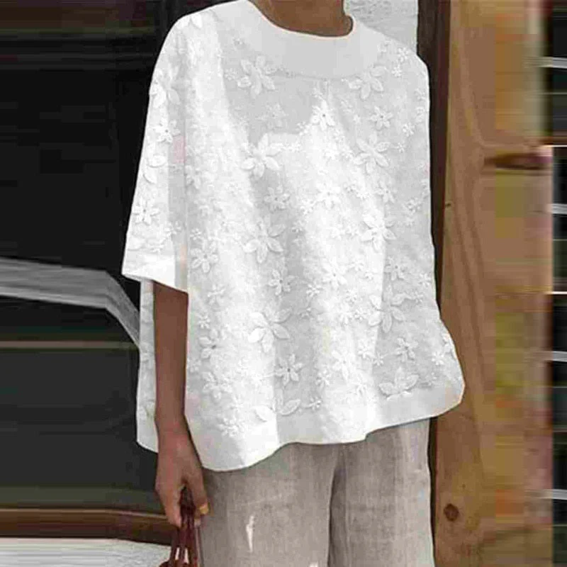 Retro Casual Cotton Lace Loose Blouse Summer Solid Color Summer Half Sleeve Beach Boho Tops Women Ruched Office Lady Shirts