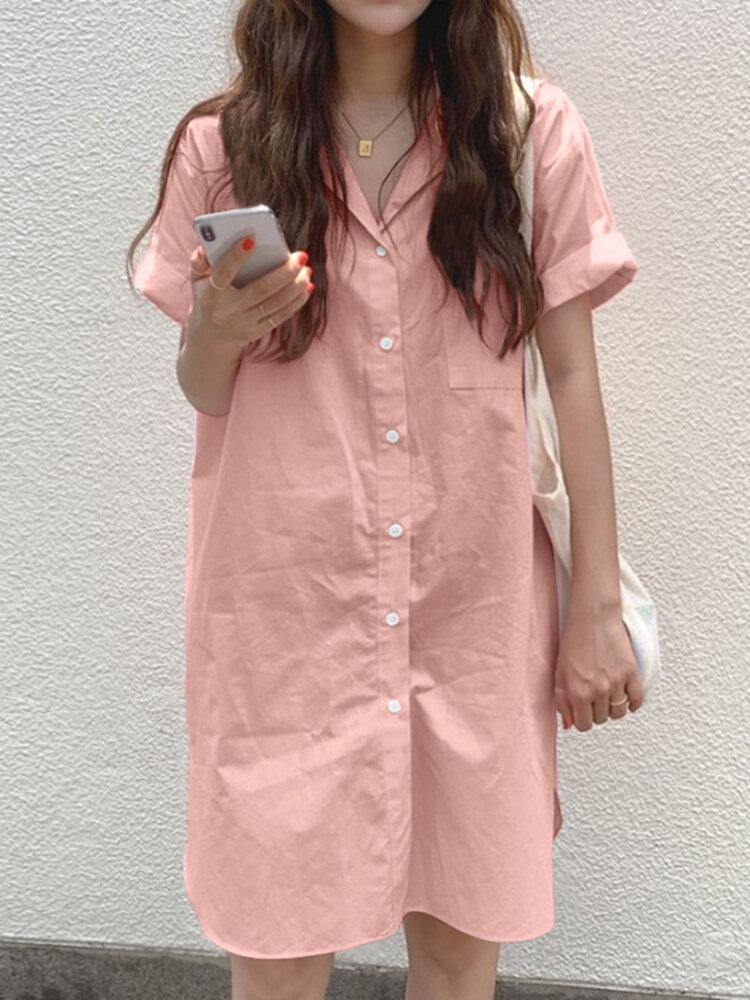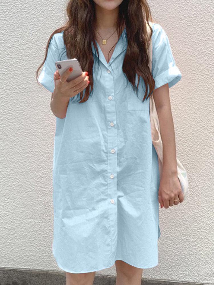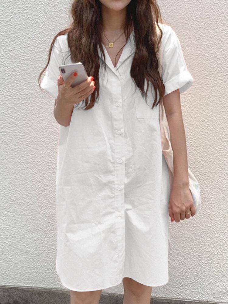 deanwangkt Solid Casual Lapel Short Sleeve Button Shirt Dress With Pocket