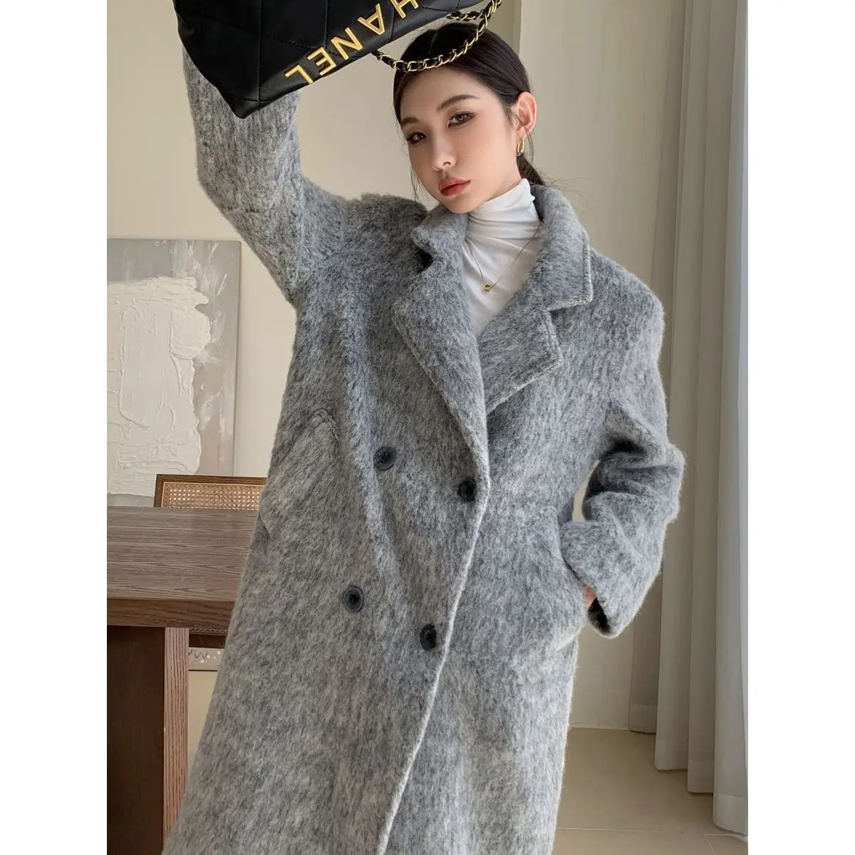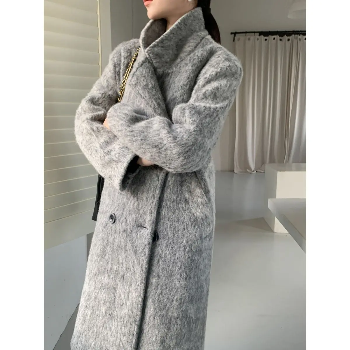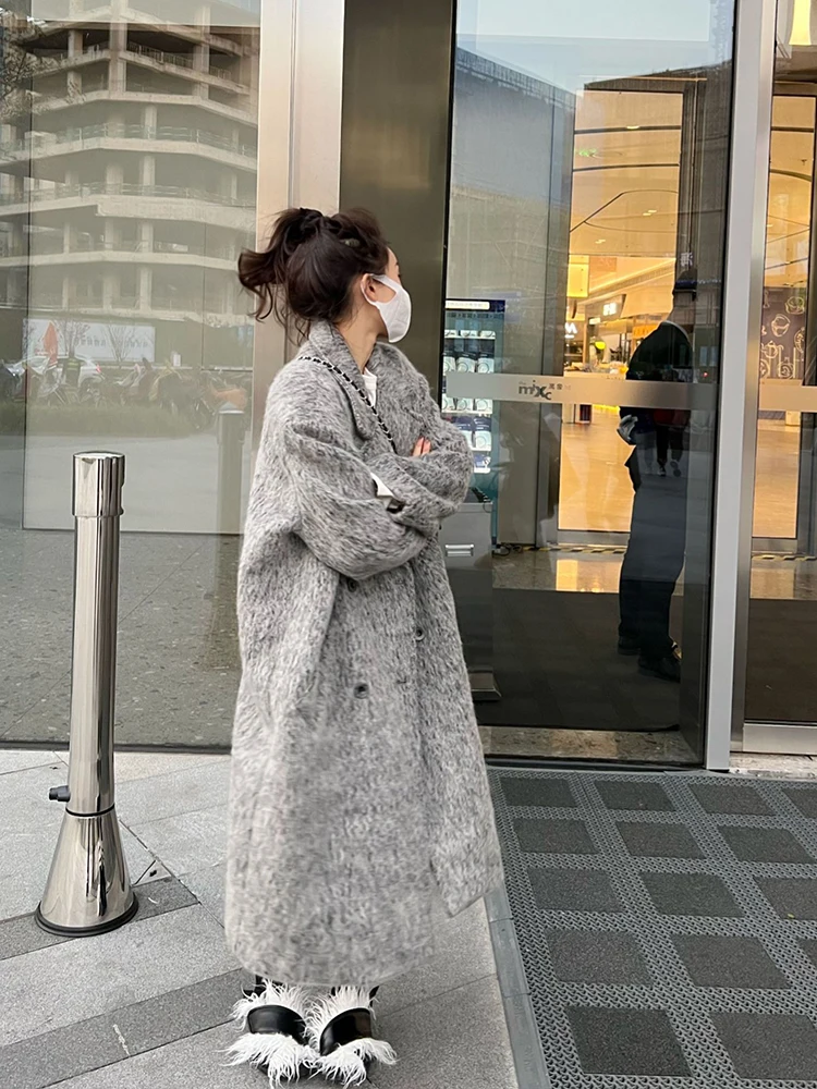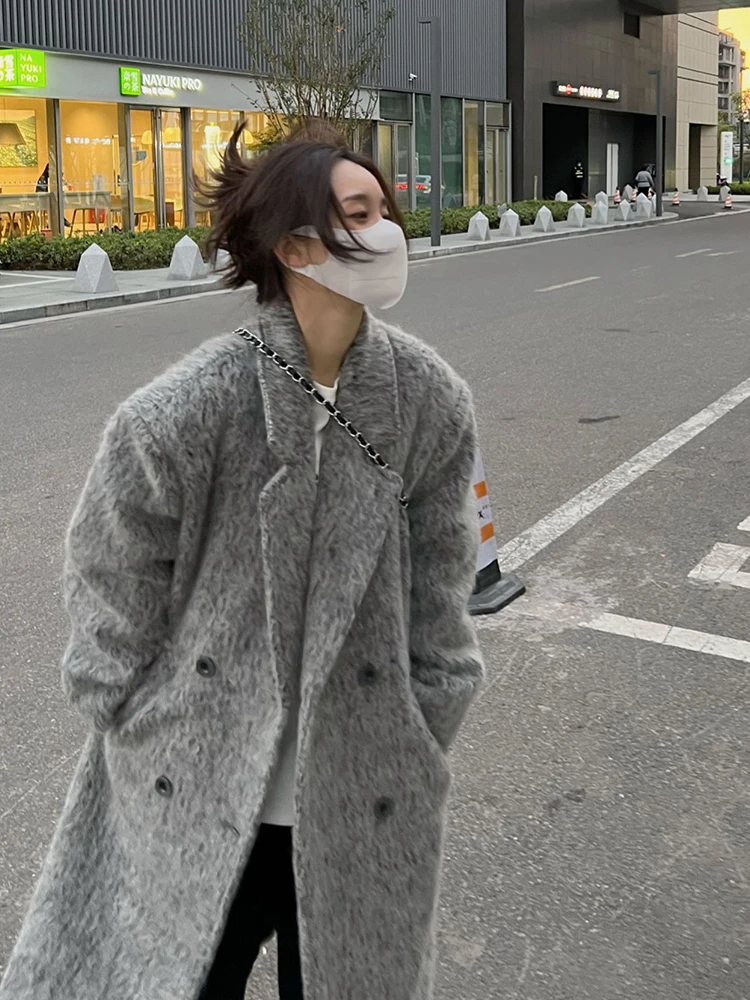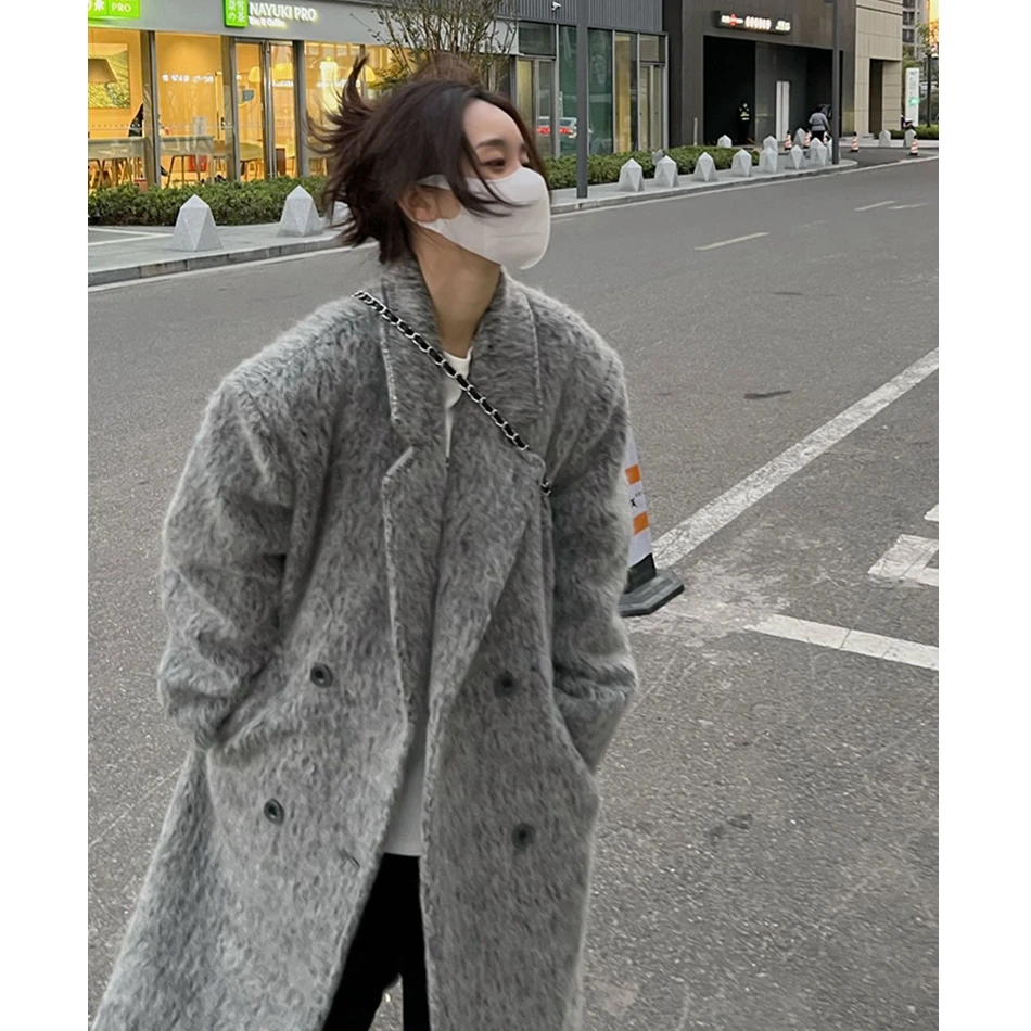 deanwangkt Mohair Long Wool Coat Women Autumn Winter New Long Sleeve Thicken Jacket Vintage Double Breasted Loose Chic Coats